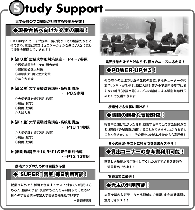 和歌山英数学館高校生クラスのEISU SUPPORTシステム。このシステムを上手く利用していくことで、高1・2生は学習習慣が身に付き、高3生は志望大学に向けてスムーズに受験勉強に取り組むことができます。入会の日から合格のその日までEISUが全力でサポートします!